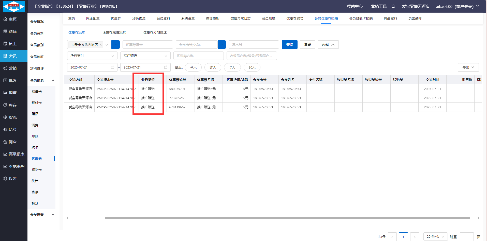 在【会员】-【会员报表】-【优惠券】查看“推广赠送”的优惠券信息