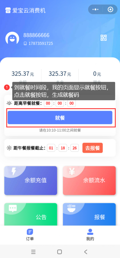 会员登录智享云库小程序,打开【我的】,已报餐后,到报餐餐段就餐时间,则会出现就餐按钮,点击就餐按钮,生成就餐码。