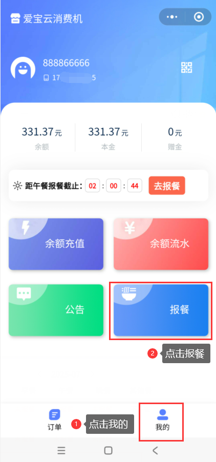 会员登录智享云库小程序,打开【我的-报餐】,选择日期餐段,点击未报餐,弹出报餐弹窗,输入报餐份数,点击确定,完成报餐,报餐状态变成已报餐,同时扣除会员余额,可打开【我的-余额流水】查看扣费详情。