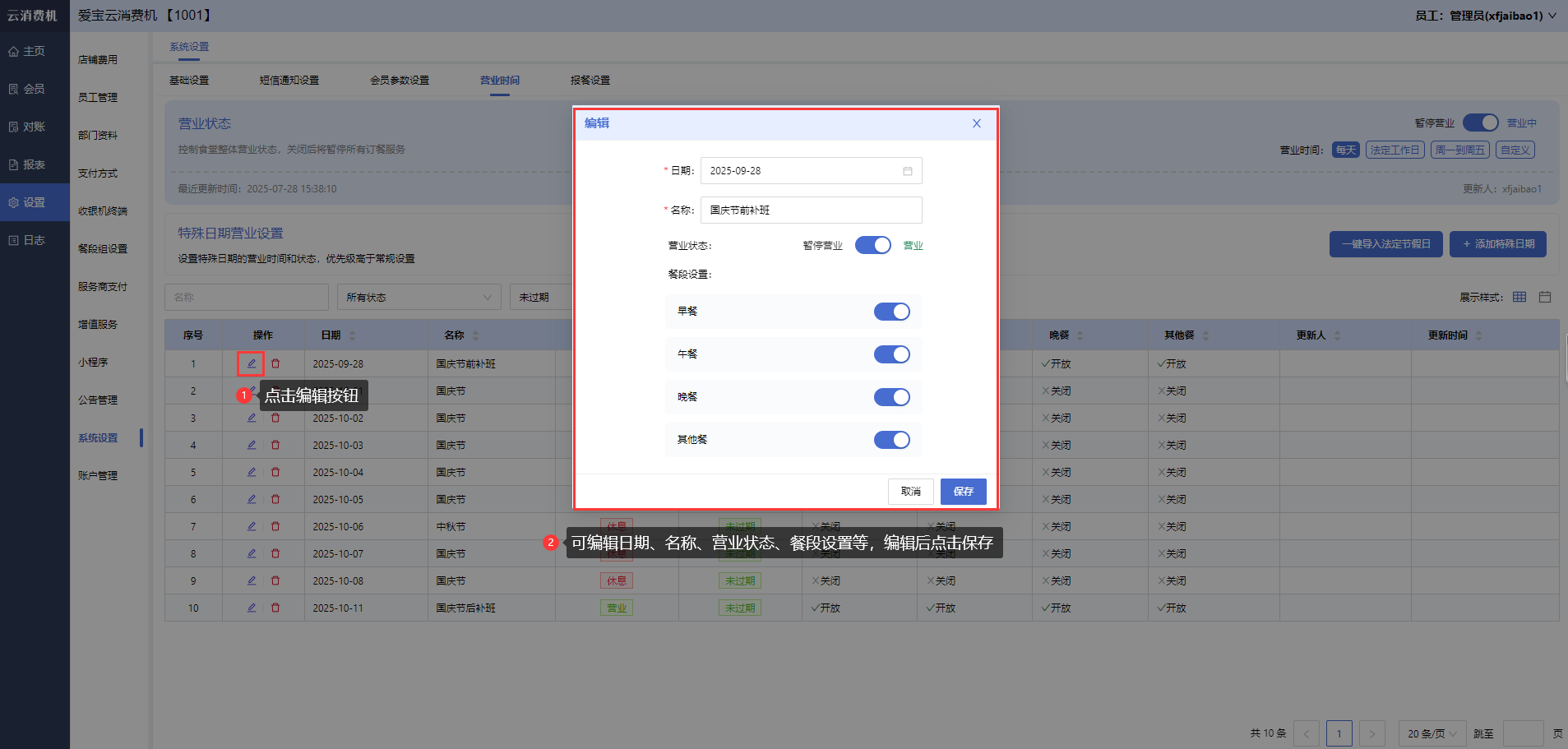 商家登录云消费机管理后台,打开【设置-系统设置-营业时间】,点击特殊日期营业设置列表数据的编辑图标,可编辑日期、名称、营业状态、餐段设置。