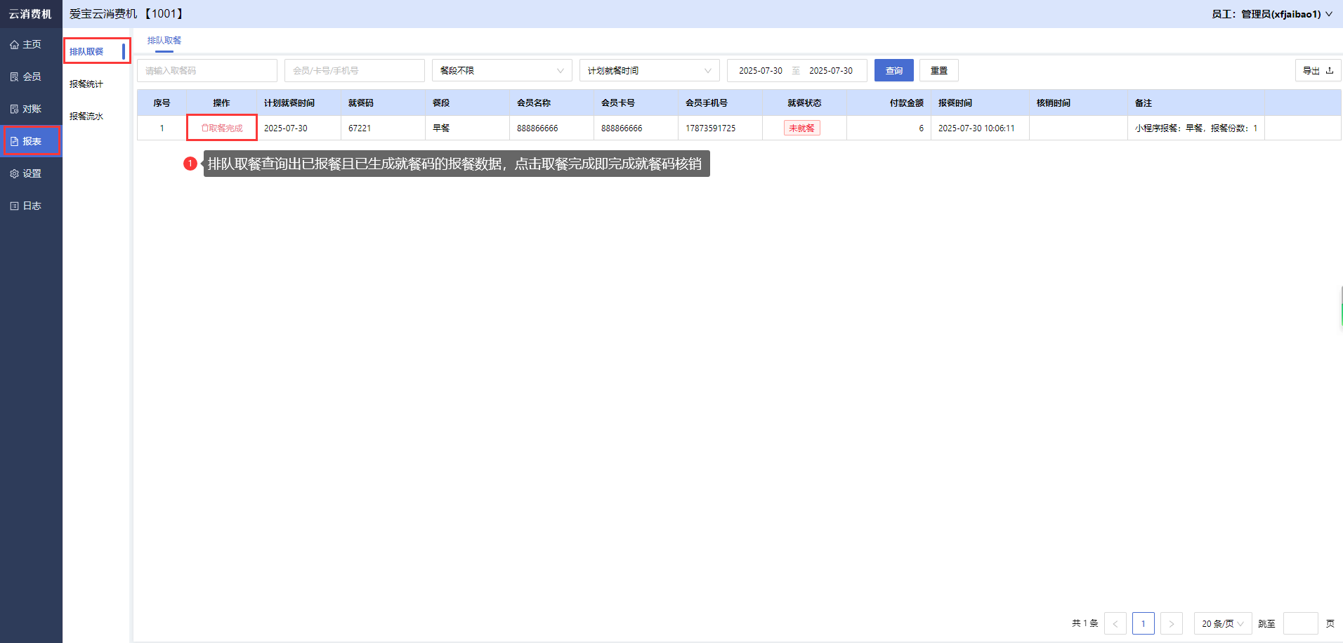 商家登录云消费机管理后台,打开【报表-排队取餐】,排队取餐查询出已报餐且已生成就餐码的报餐数据,点击取餐完成即完成就餐码核销,就餐码核销后可去报餐流水页面查看具体数据。