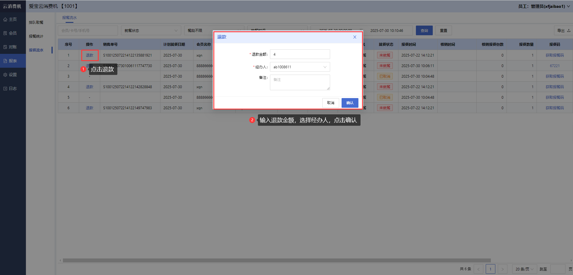 商家登录云消费机管理后台,打开【报表-报餐流水】,可查看具体的报餐流水,对于已付款的报餐流水,可进行退款,点击退款按钮,弹出退款弹窗,输入退款金额,选择经办人,点击确认,输入验证码后,点击确认,完成报餐退款。