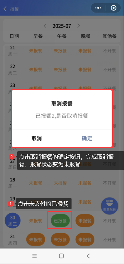 会员登录智享云库小程序,打开【我的-报餐】,点击已报餐且未支付的餐段,弹出确认取消报餐的弹窗,点击弹窗的确定按钮,取消报餐成功,报餐状态变成未报餐。