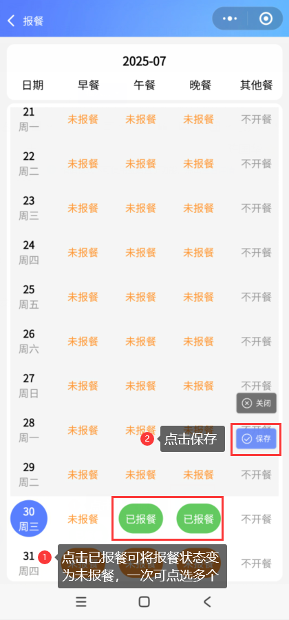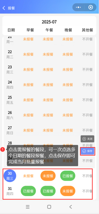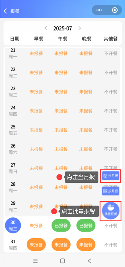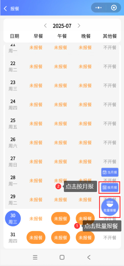 会员登录智享云库小程序,打开【我的-报餐】,点击批量报餐,点击当月报,点击需报餐的餐段,可一次选择多个日期的餐段报餐,点击保存即可完成当月批量报餐。