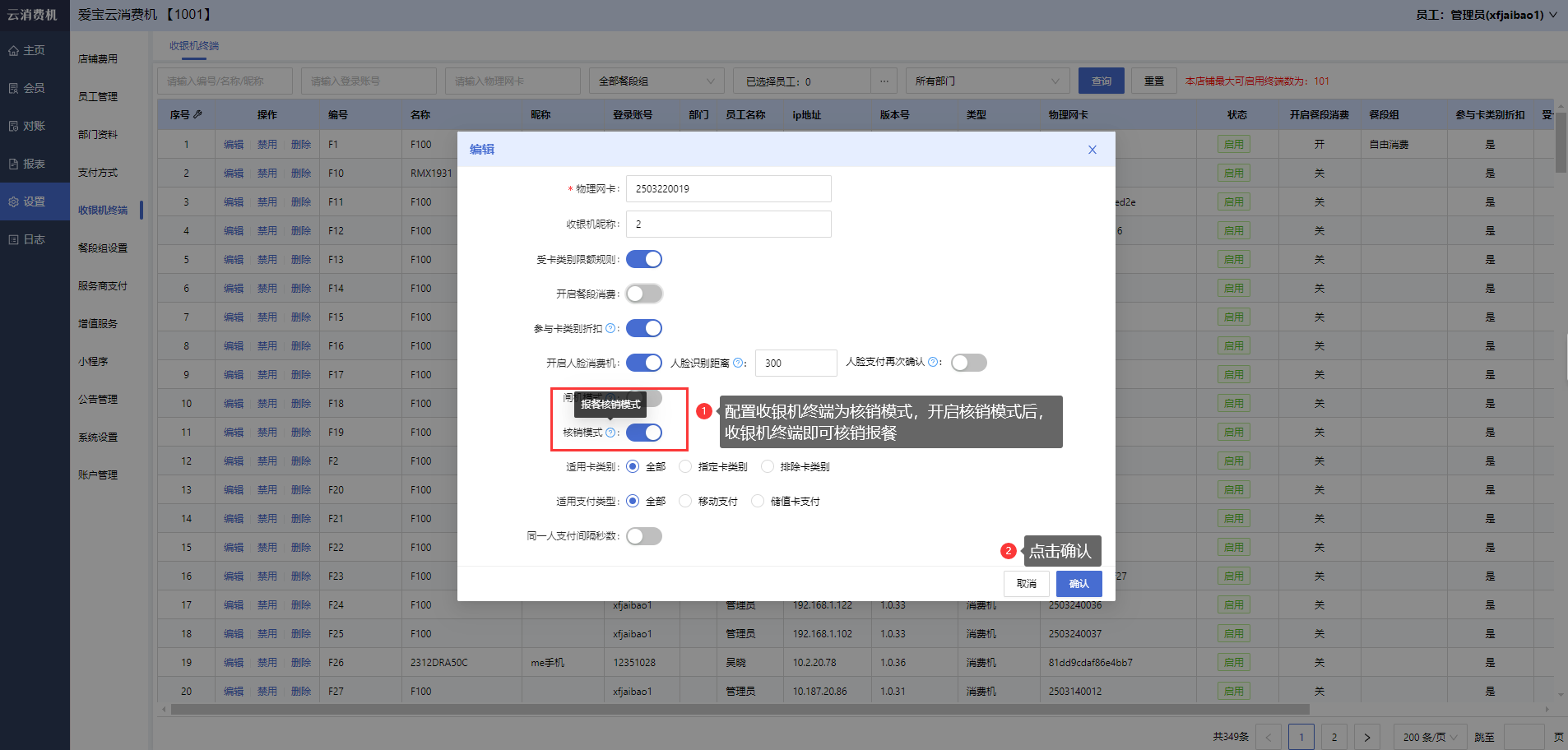 打开【设置-收银机终端】,编辑终端,配置收银机终端为核销模式(核销模式即为报餐核销模式)。