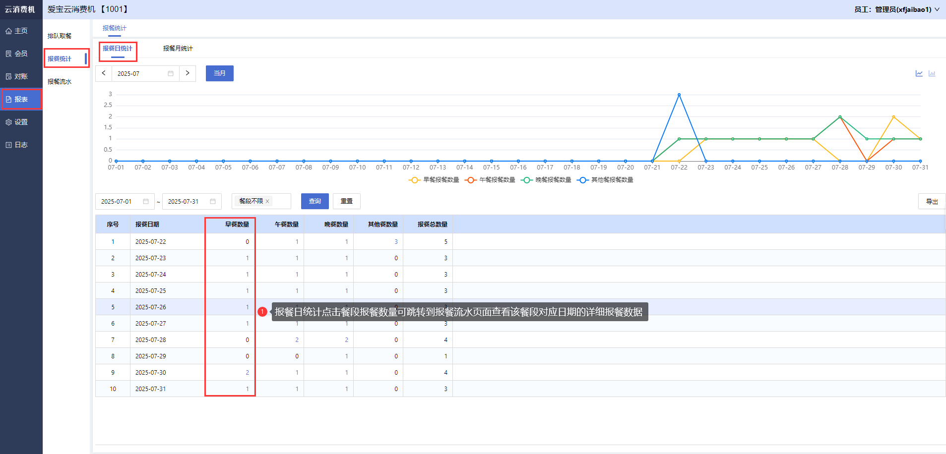 商家登录云消费机管理后台,打开【报表-报餐统计】,可查看报餐日统计/报餐月统计,报餐日统计点击餐段报餐数量可跳转到报餐流水页面查看该餐段对应日期的详细报餐数据,报餐月统计点击餐段报餐数量可跳转到报餐流水页面查看该餐段对应月份的详细报餐数据。