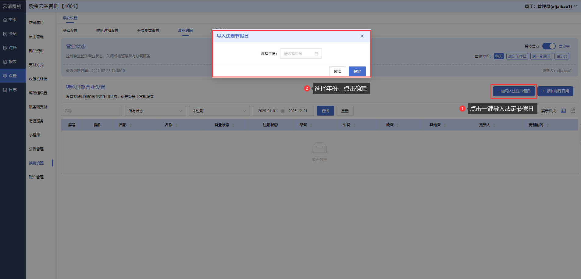 商家登录云消费机管理后台,打开【设置-系统设置-营业时间】,点击一键导入法定节假日按钮,选择年份,点击确定按钮完成导入。