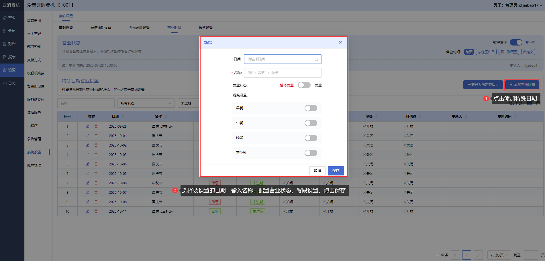 商家登录云消费机管理后台,打开【设置-系统设置-营业时间】,点击添加特殊日期按钮,弹出新增弹窗,选择日期、输入名称,配置营业状态、餐段设置。