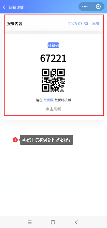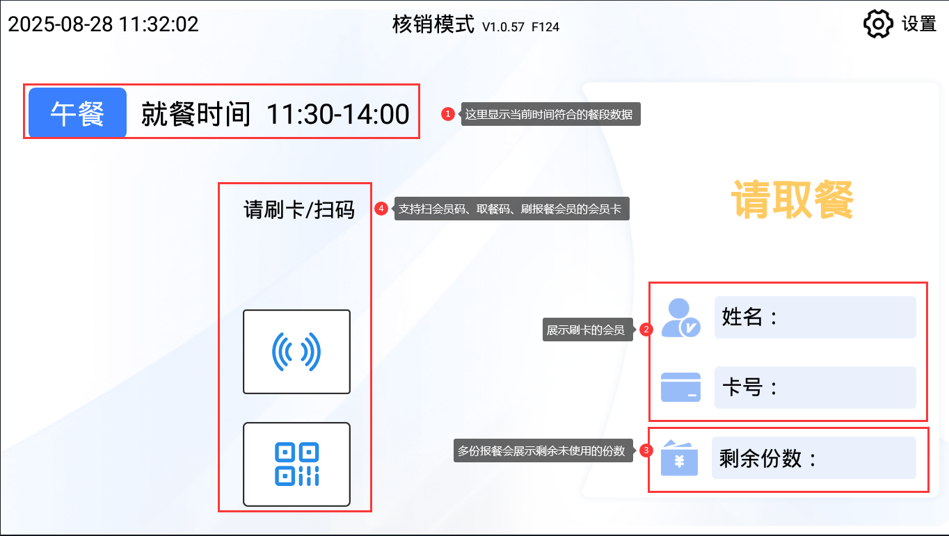 登录开启了核销模式的消费机终端,到餐段时间时,已报餐的会员可以使用会员码/会员卡/就餐码,刷码就餐。