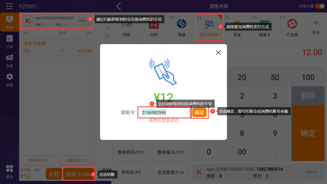3.如果需要使用云消费机会员的余额,扫脸成功后,需要选择消费机支付方式支付,才能扣取消费机会员余额(图12)。
