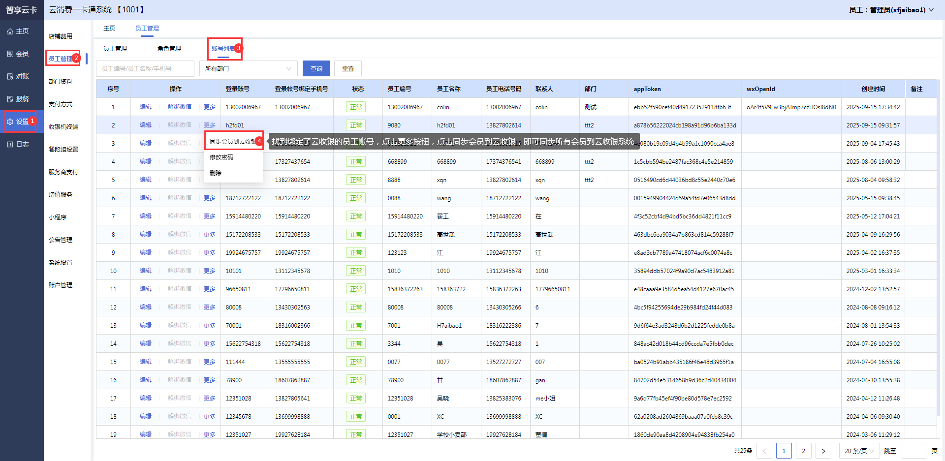 方法一:云收银绑定消费机后,可以登录消费机系统,打开设置-员工管理-账号列表-同步会员到云收银,即可同步所有会员到云收银系统,配置如图6;