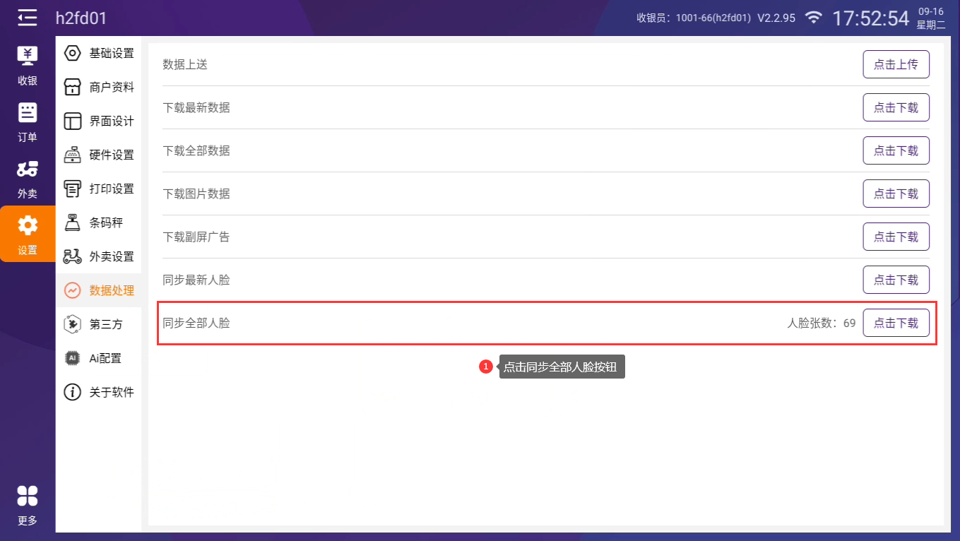 1.登录安卓收银,打开设置-数据处理,点击同步全部人脸的点击下载按钮,下载全部人脸数据,如图2;注意,每次存在会员新增人脸都需要手动点击下载人脸。
