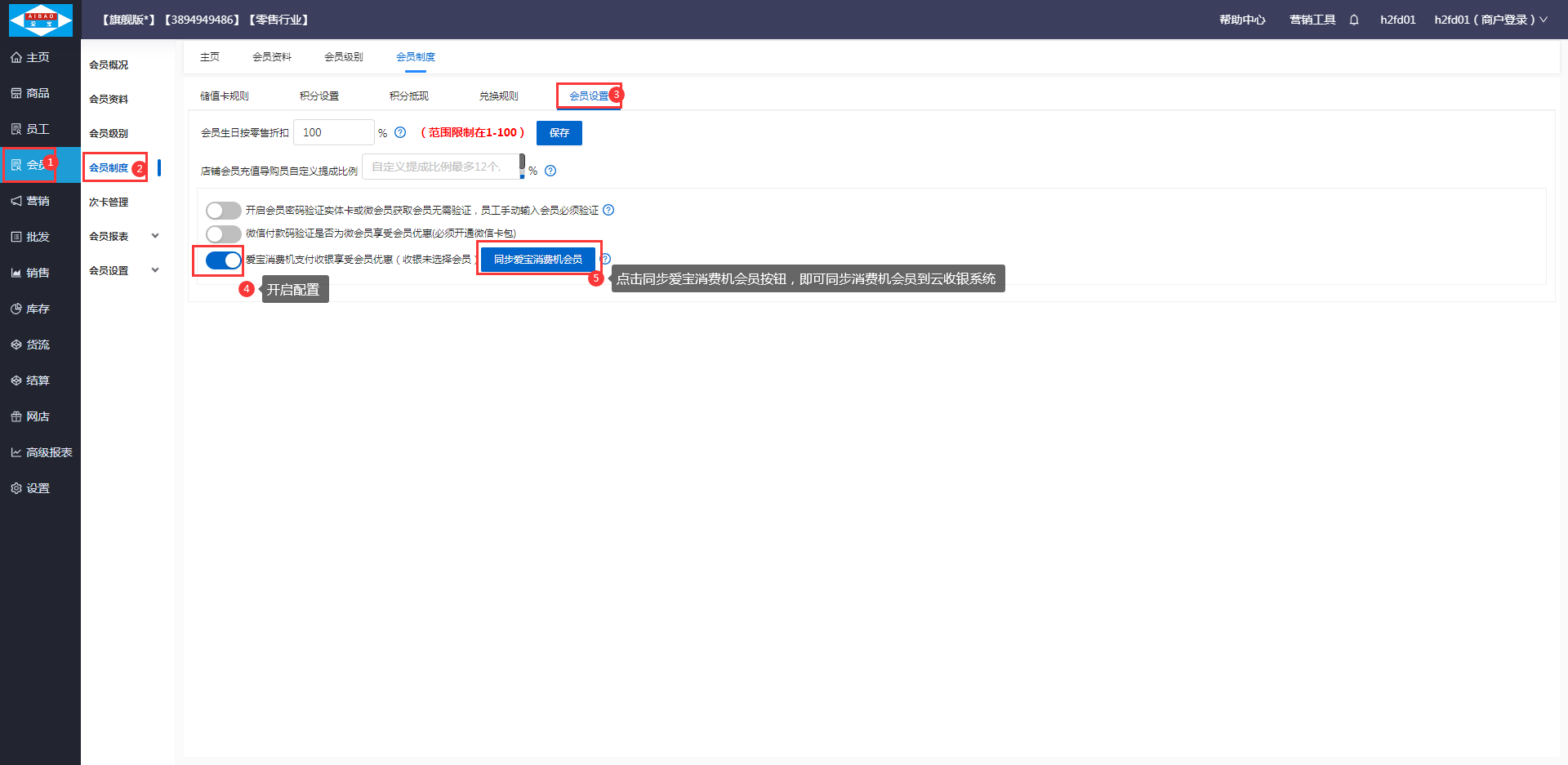 方法二:云收银绑定消费机后,登录云收银后台,打开会员-会员制度-会员设置,开启爱宝消费机支付收银享受会员优惠(收银未选择会员),点击同步爱宝消费机会员按钮,即可同步会员到云收银系统,配置如图7。