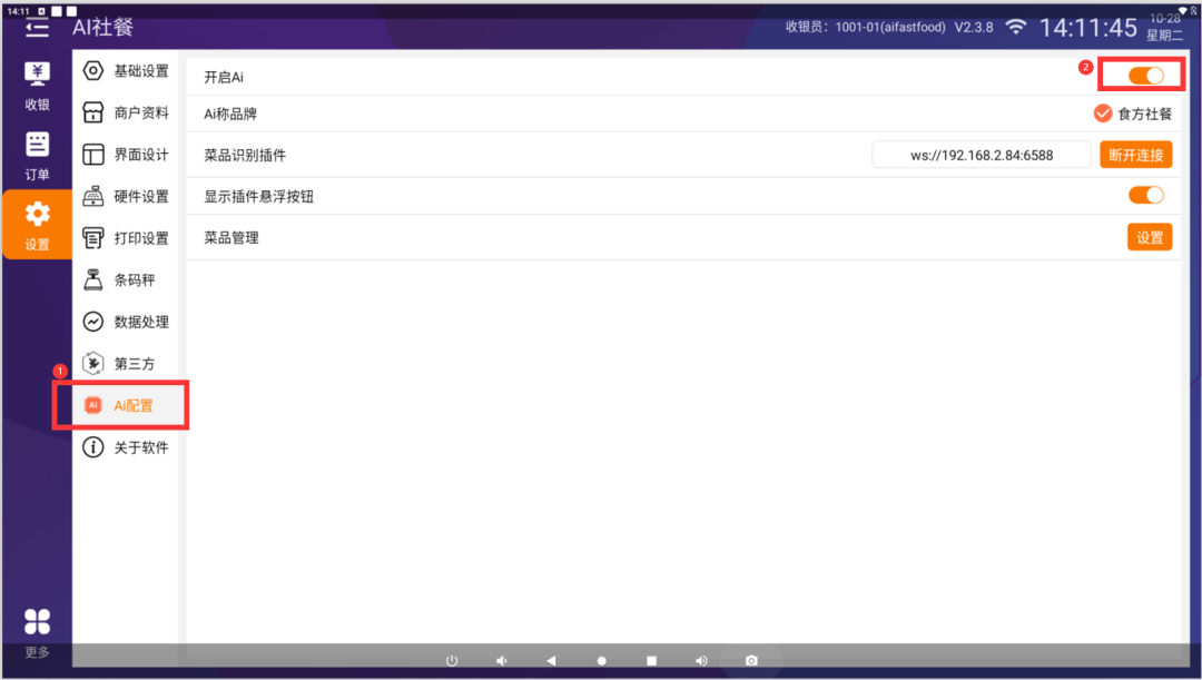 在收银界面点击【AI菜品识别】打开AI插件,把装有菜的餐盘放入识别结算区,待软件把菜品识别出来后,点【加购】,然后稍核对菜品,接着点结账或扫码付款就可完成结算。操作如下视频所示:
