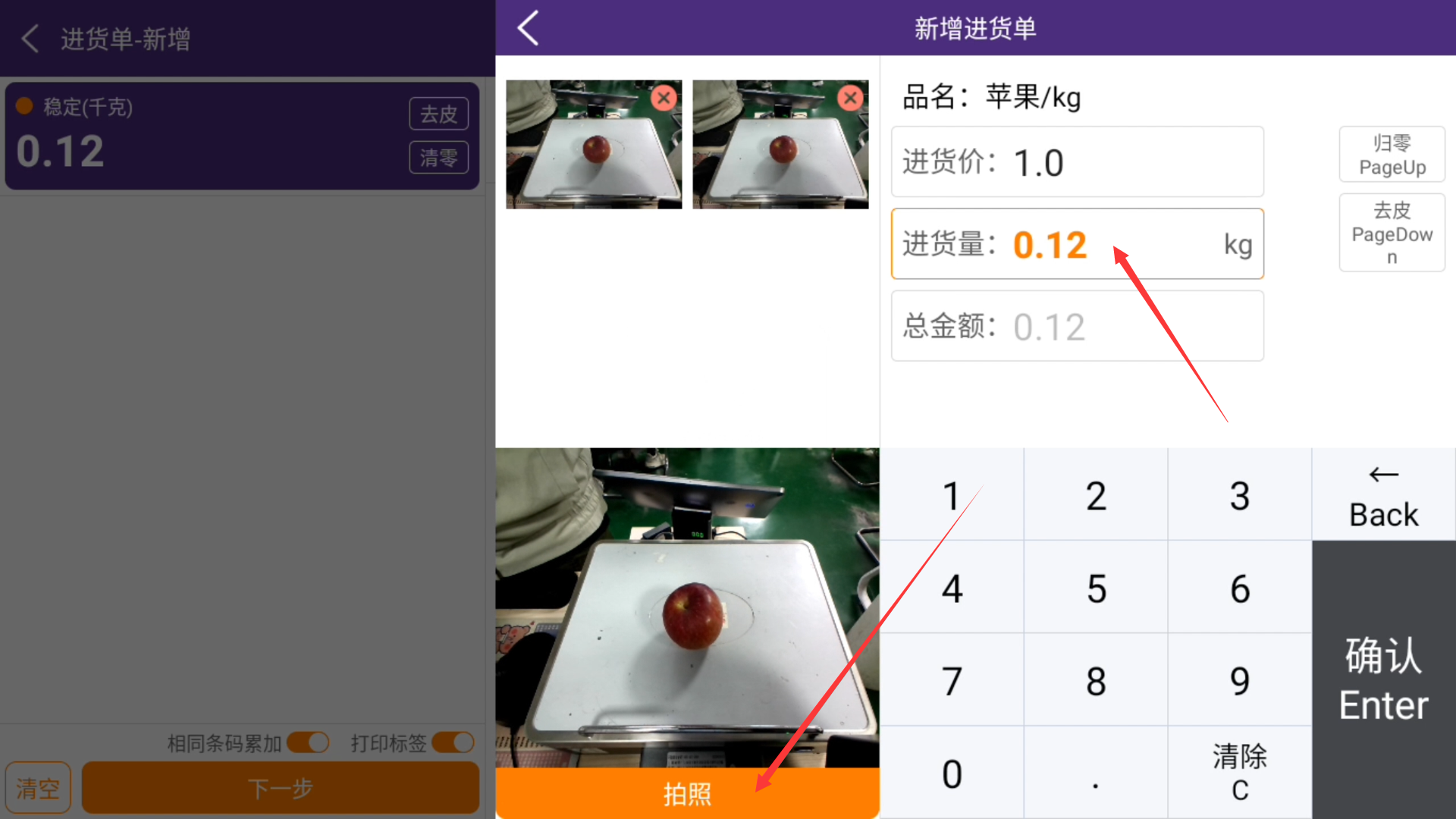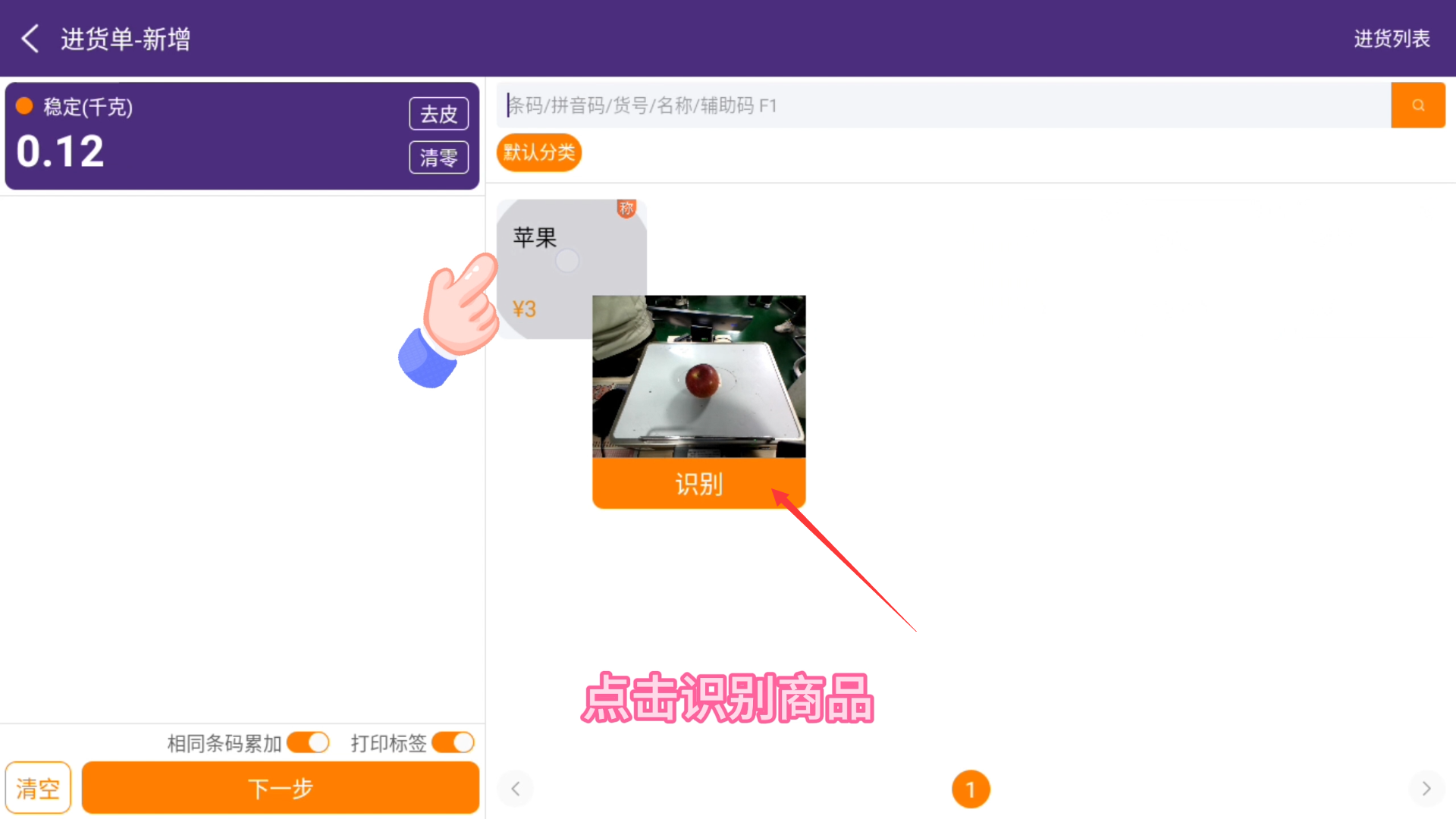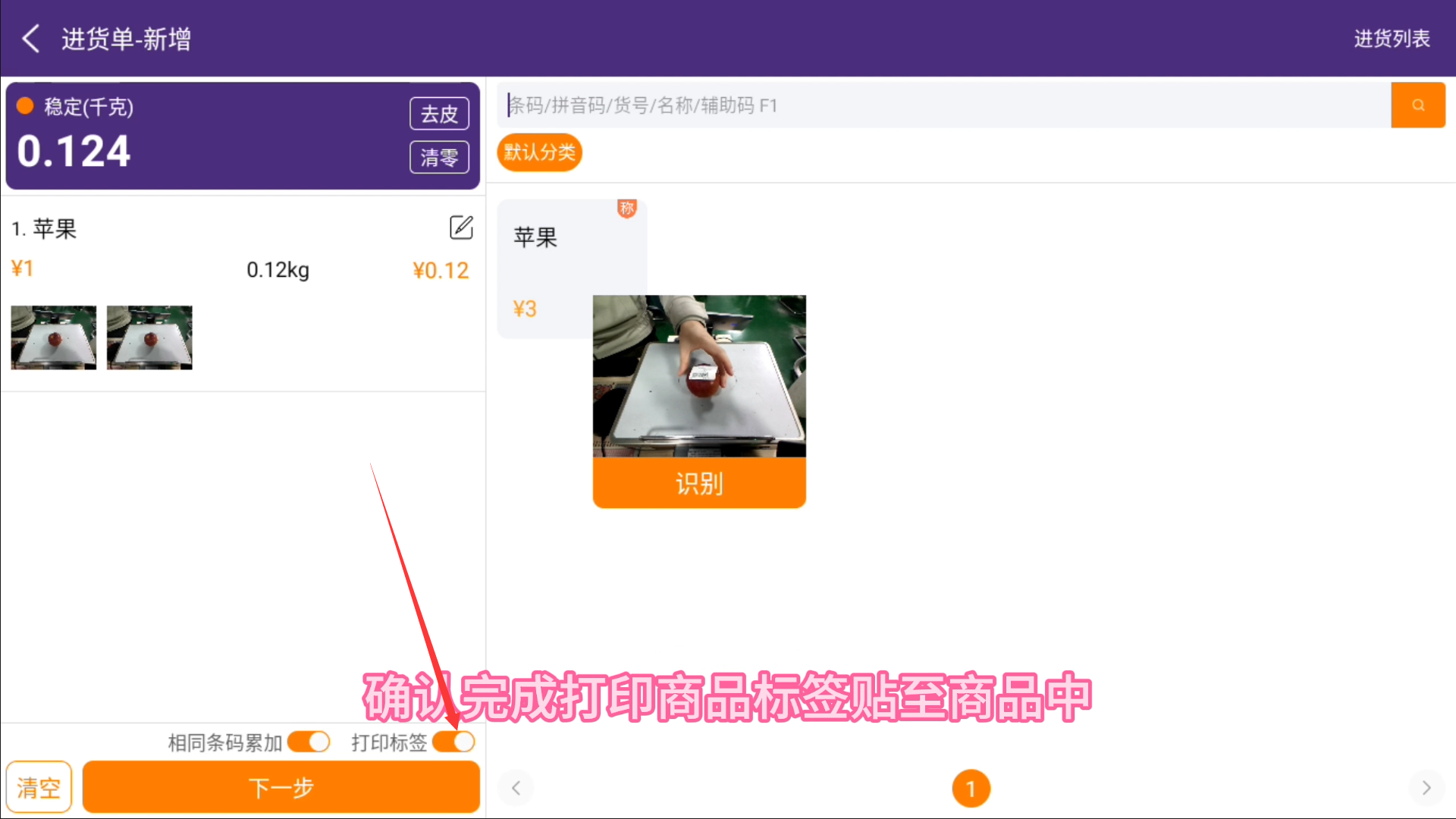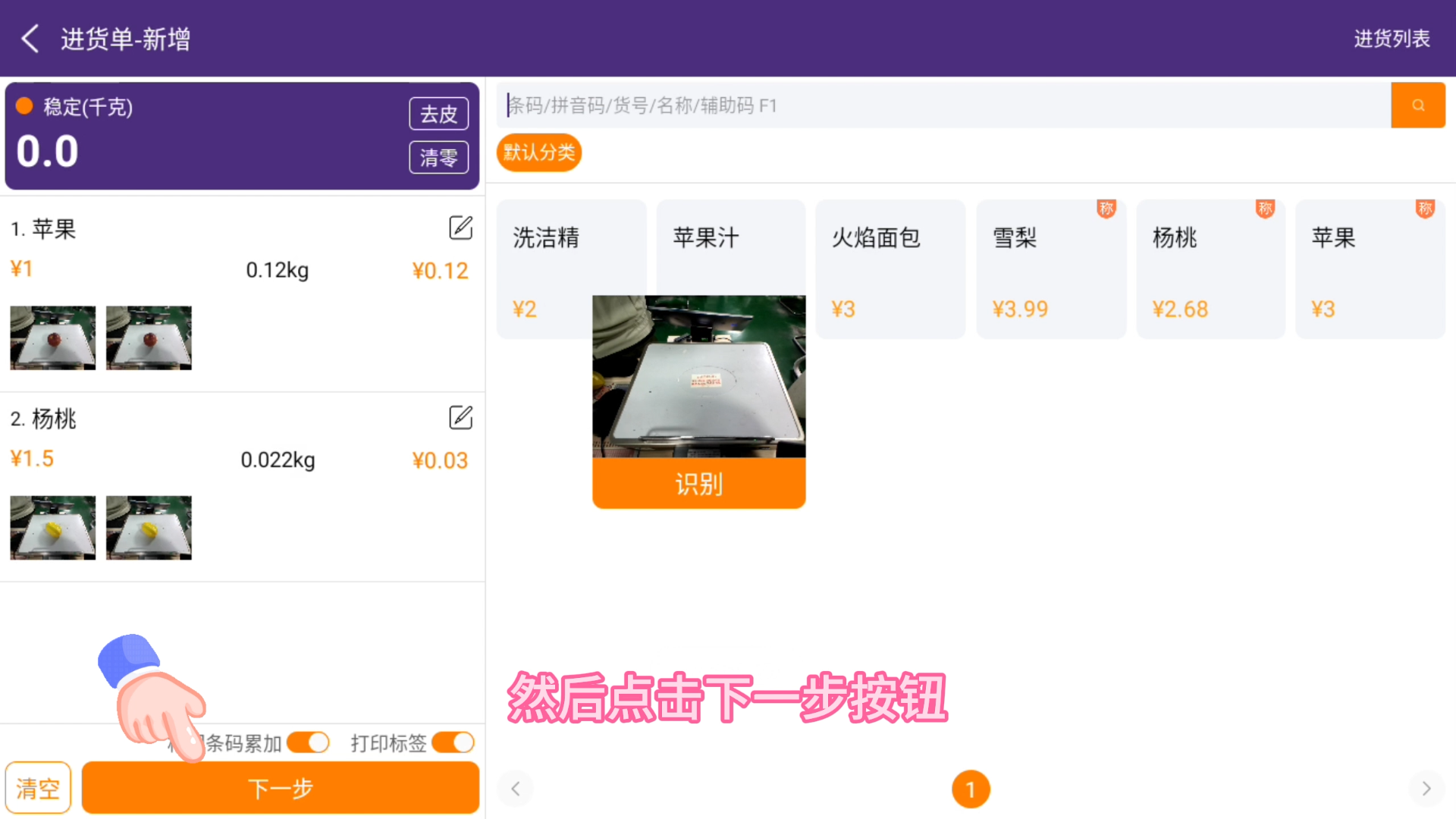 收银首页【更多】-【进货单】-【AI称重进货】秤盘放商品点识别,选择商品,输入进货数量,对进货商品进行拍照确认,然后点击下一步