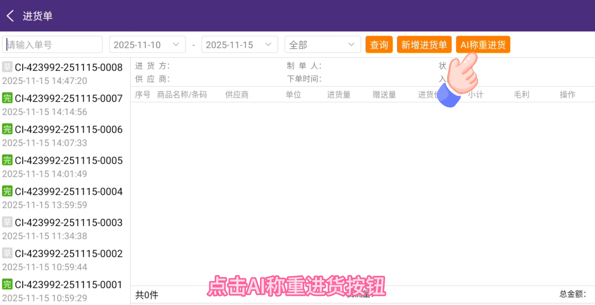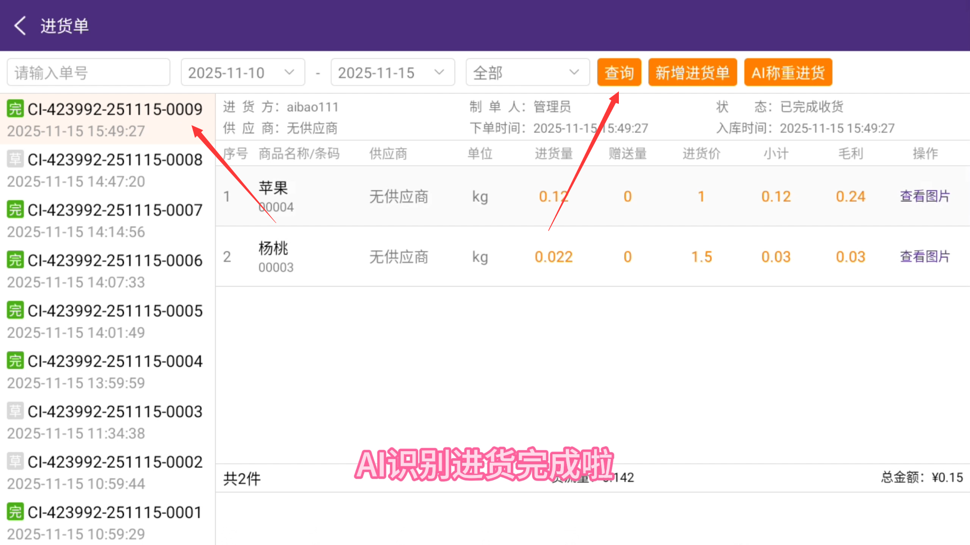 第四步,AI进货完成后,返回进货界面,点击查询,可看到当前进货的单据。