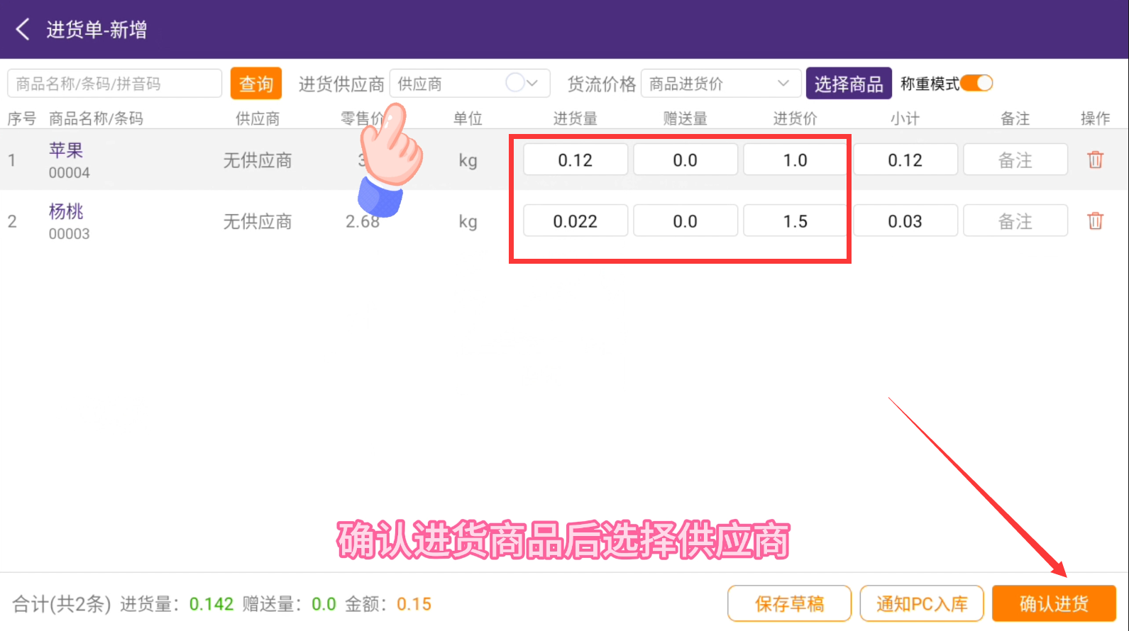 第三步:确认进货商品后选择供应商,点击确认进货,完成进货。当前界面可修改进货量,赠送量,进货价。