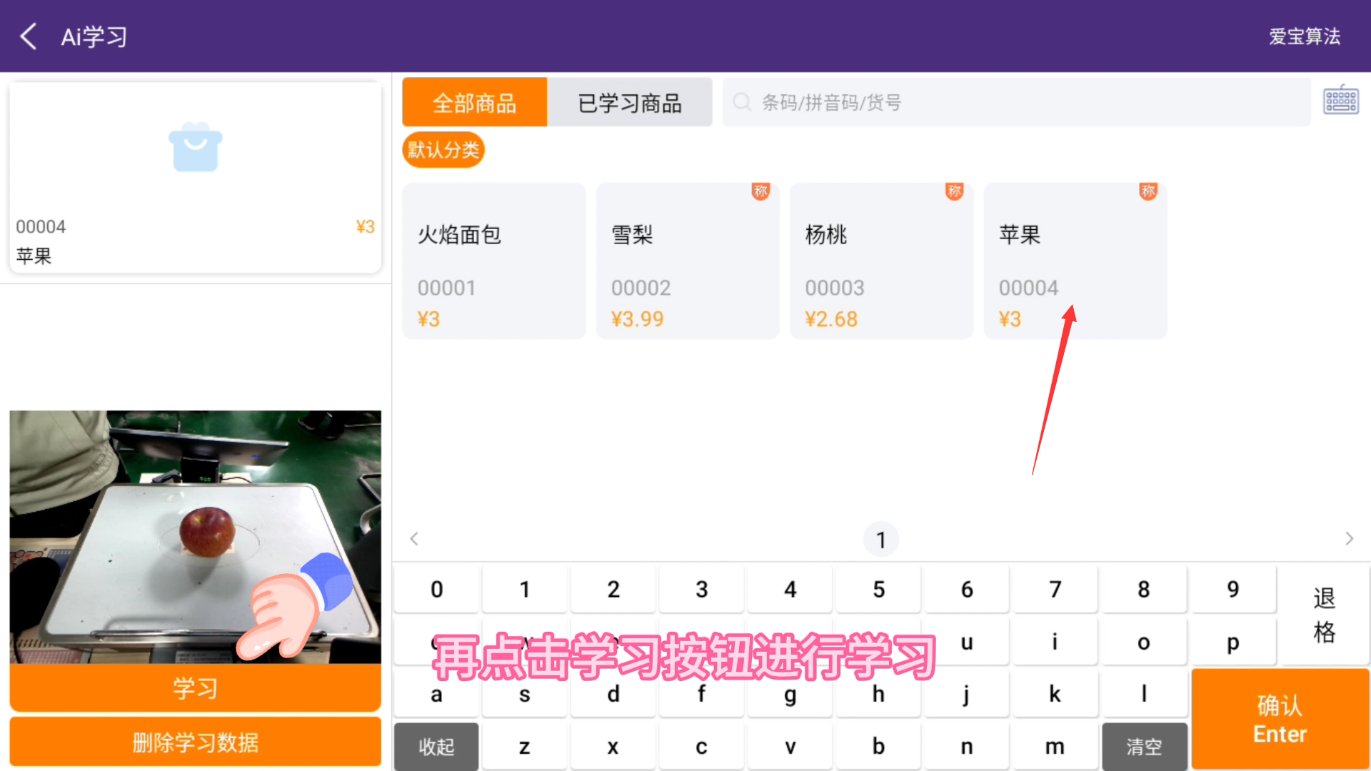 收银首页【更多】-【AI学习】秤盘上放商品,右侧选择商品,点击学习,显示学习成功,再多角度学习。