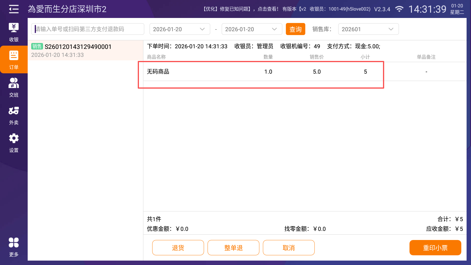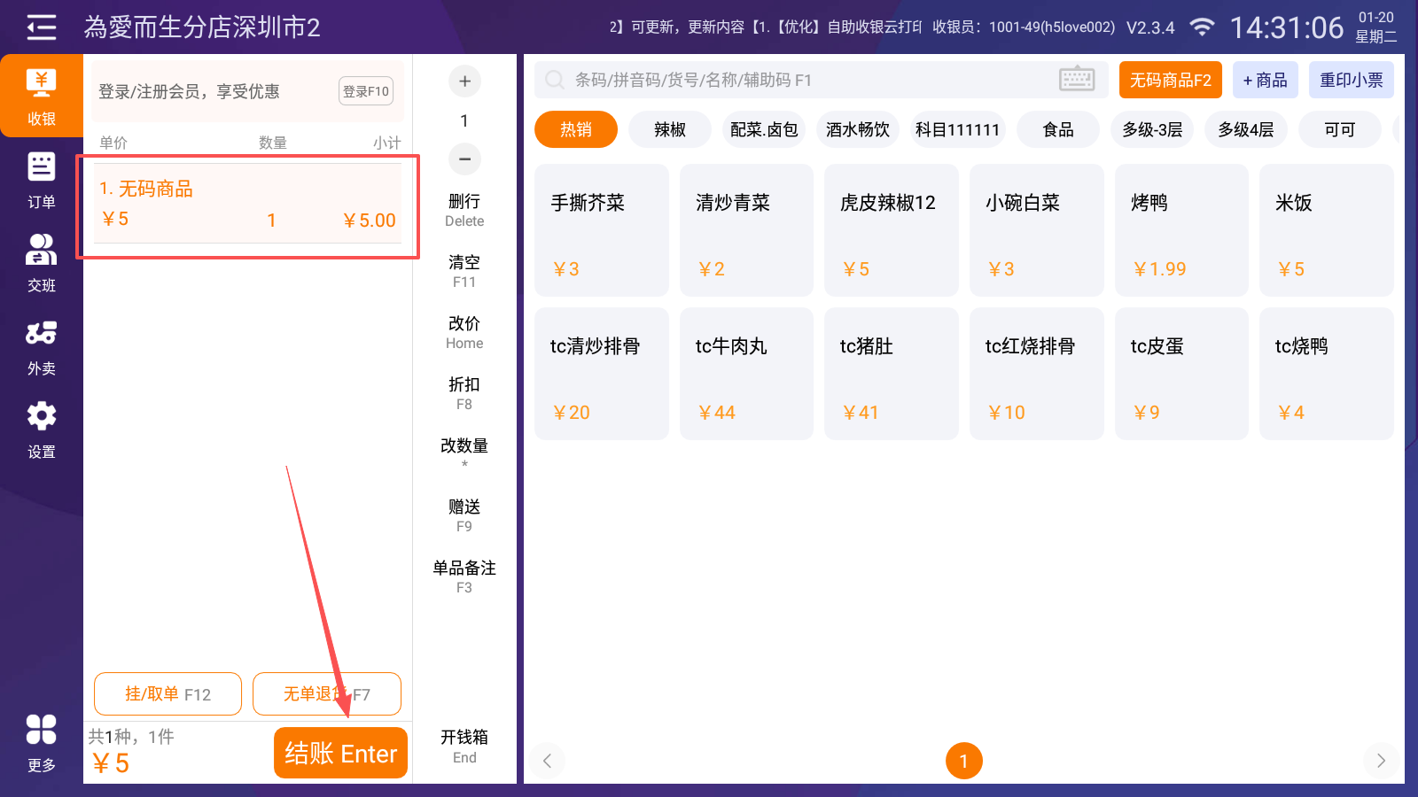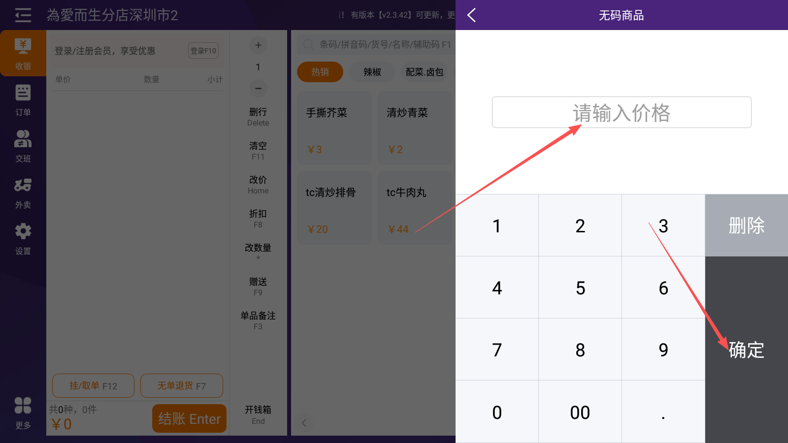点击“无码商品”按钮(快捷键F2),输入价格点击确认即可添加无码商品到购物车,再收款就行