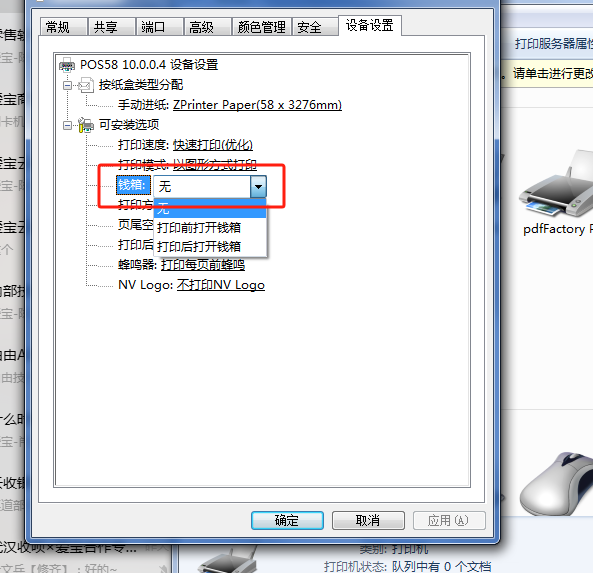 找到打印机驱动设备设置界面,设置图中地方,设置打印后开钱箱,打印一张测试页,测试钱箱开不开