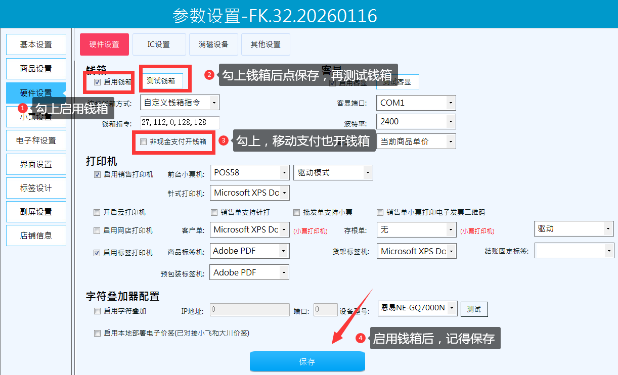 ①钱箱连接好打印机 ②云收银前台开启钱箱[前台更多-参数设置-硬件设置] ③测试钱箱