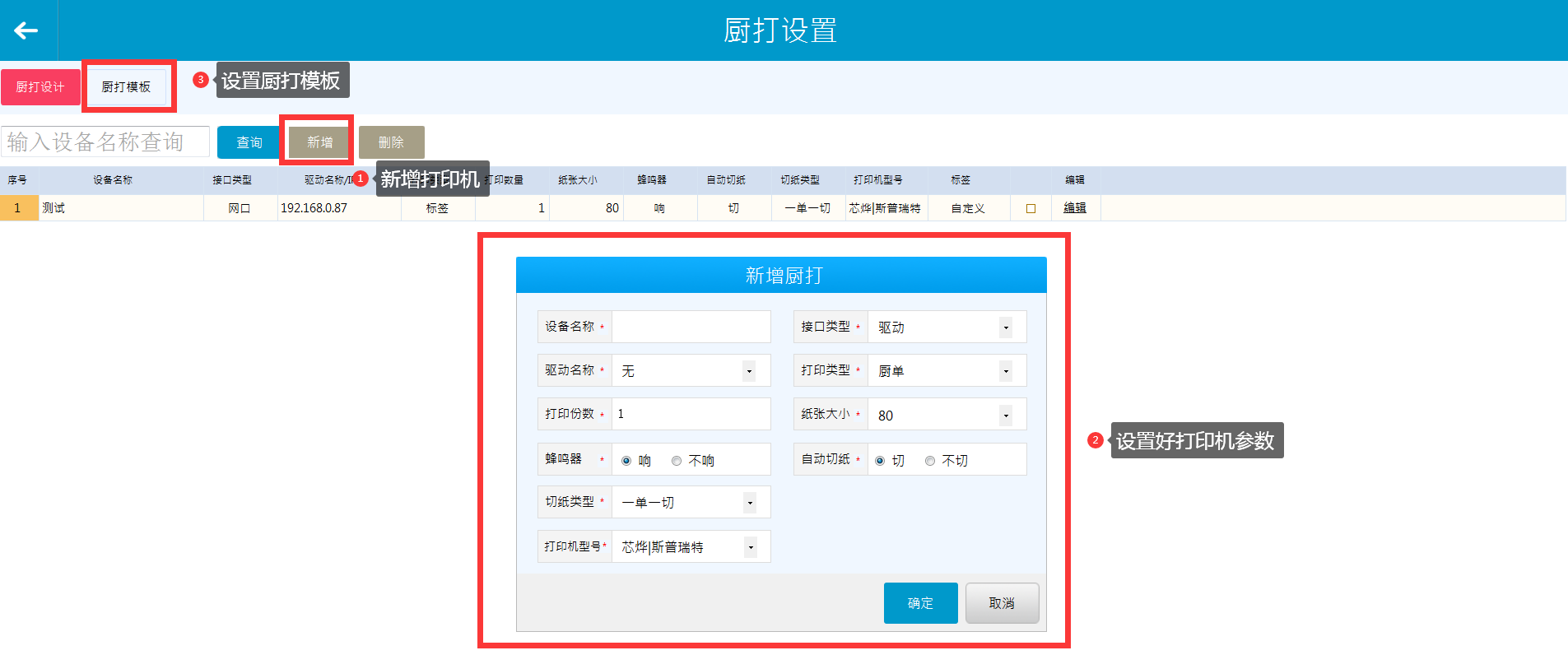 前台更多-厨打设置添加打印机,并设置模板