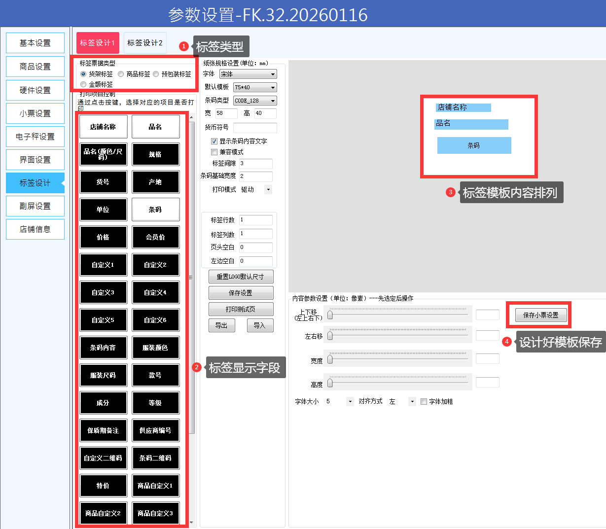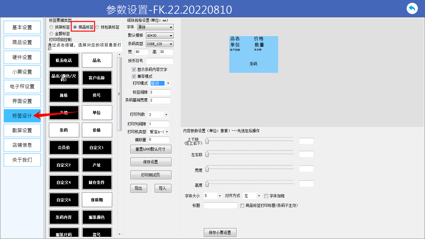 标签格式设置:前台更多---参数设置--标签设计--商品标签--保存小票设置。