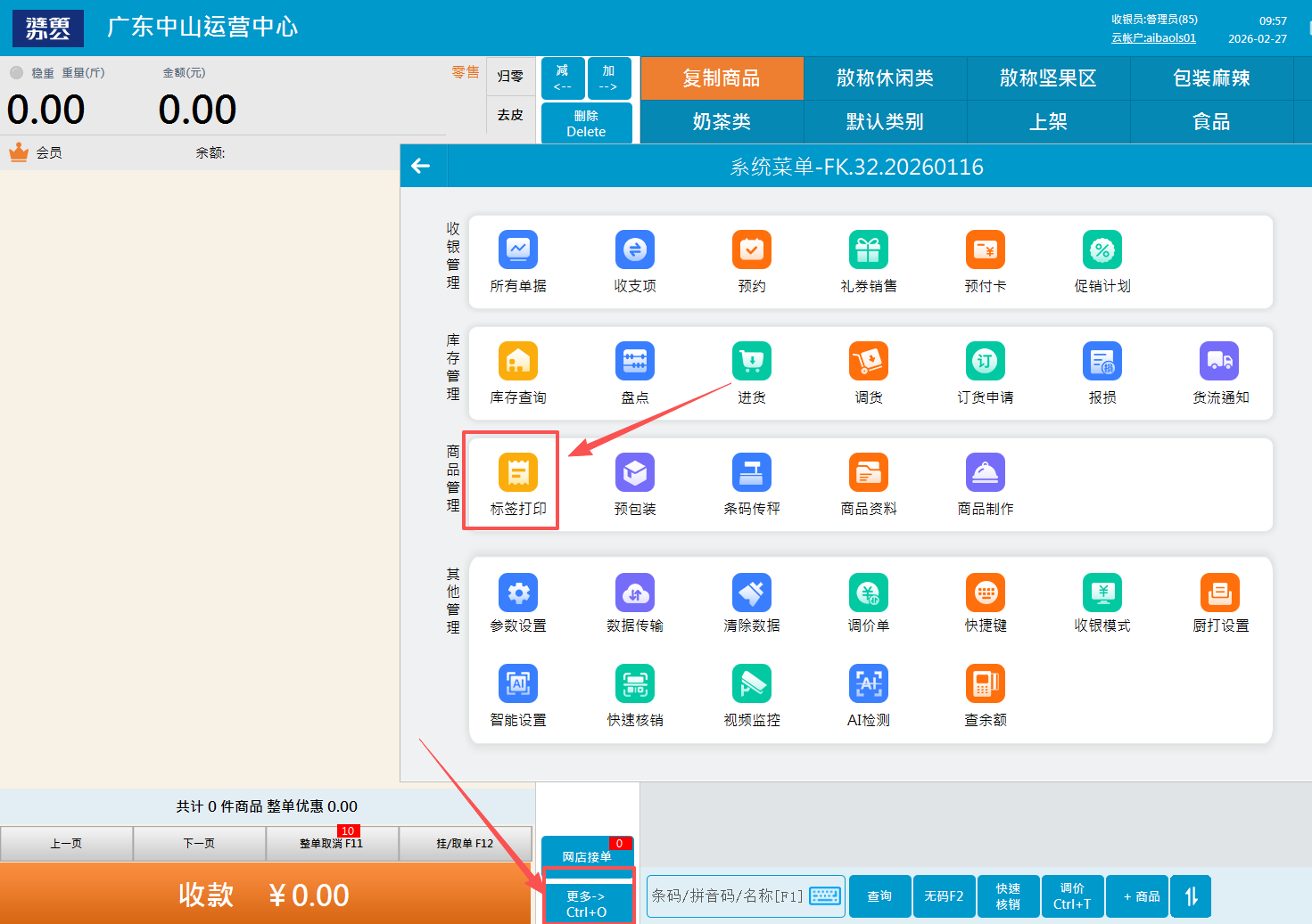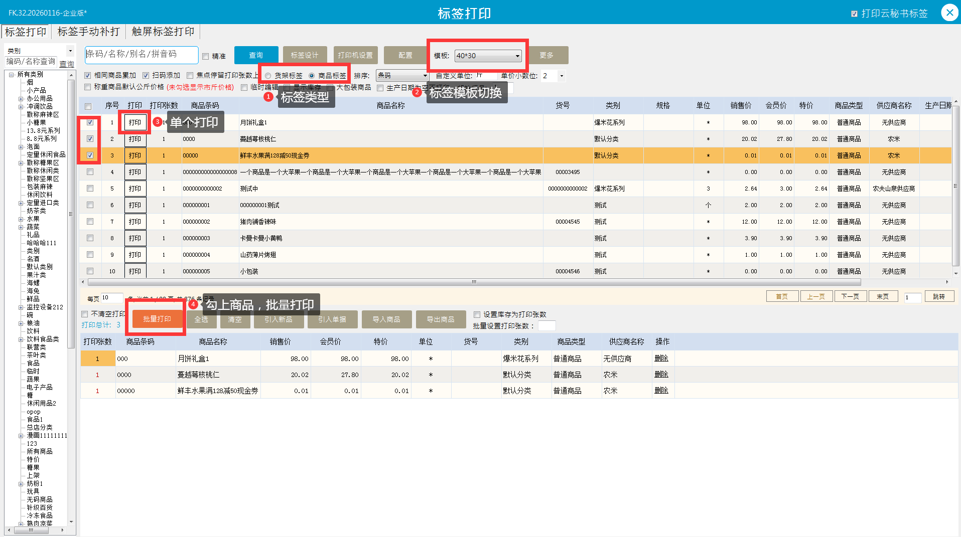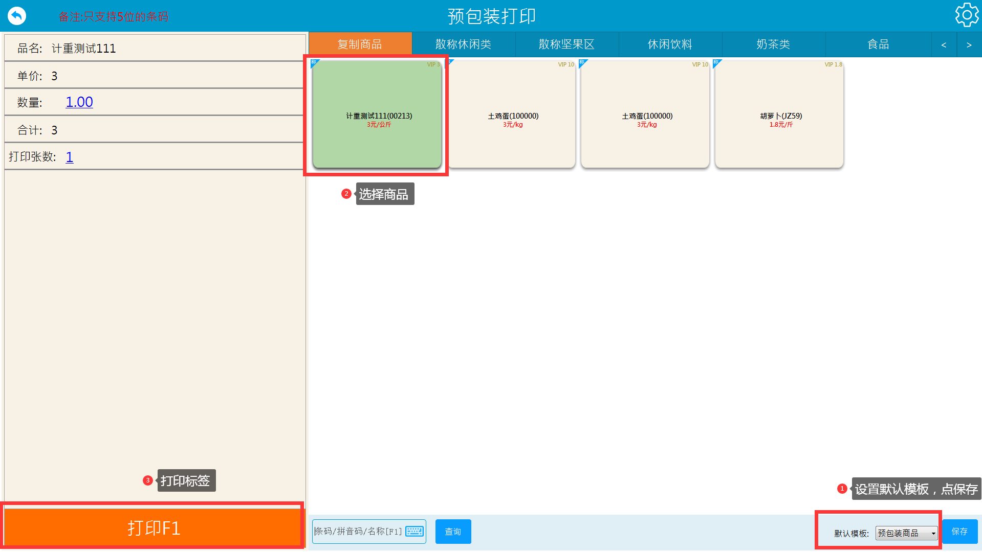 ①云收银后台商品资料关联打印机(可批量设置) ②前台标签格式选择商品标签