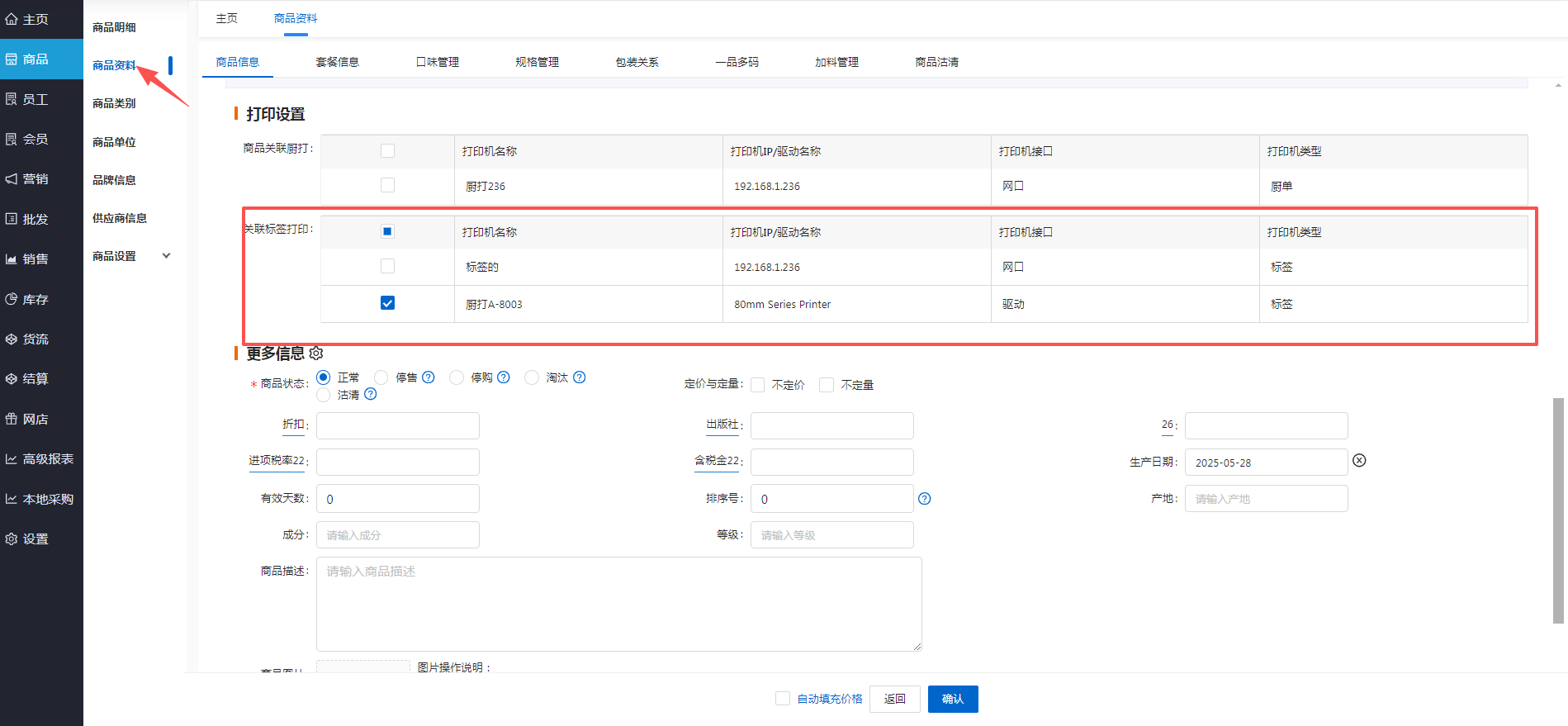 后台商品资料-编辑,设置商品关联标签打印,选择对应的打印机,确认保存。