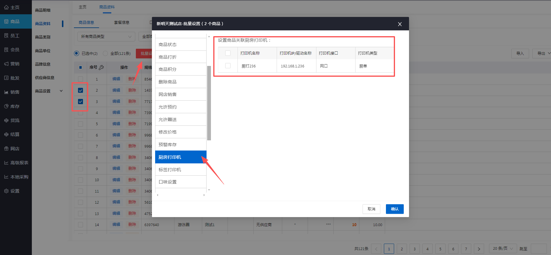 后台商品资料-编辑,设置商品关联厨打,选择对应的打印机,确认保存。