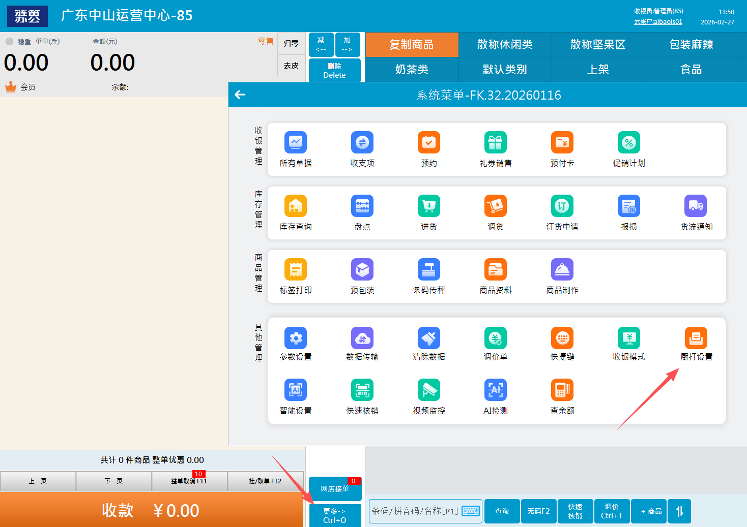 ①前台添加打印机 ②云收银后台商品资料关联打印机(可批量设置) ③前台选择厨打