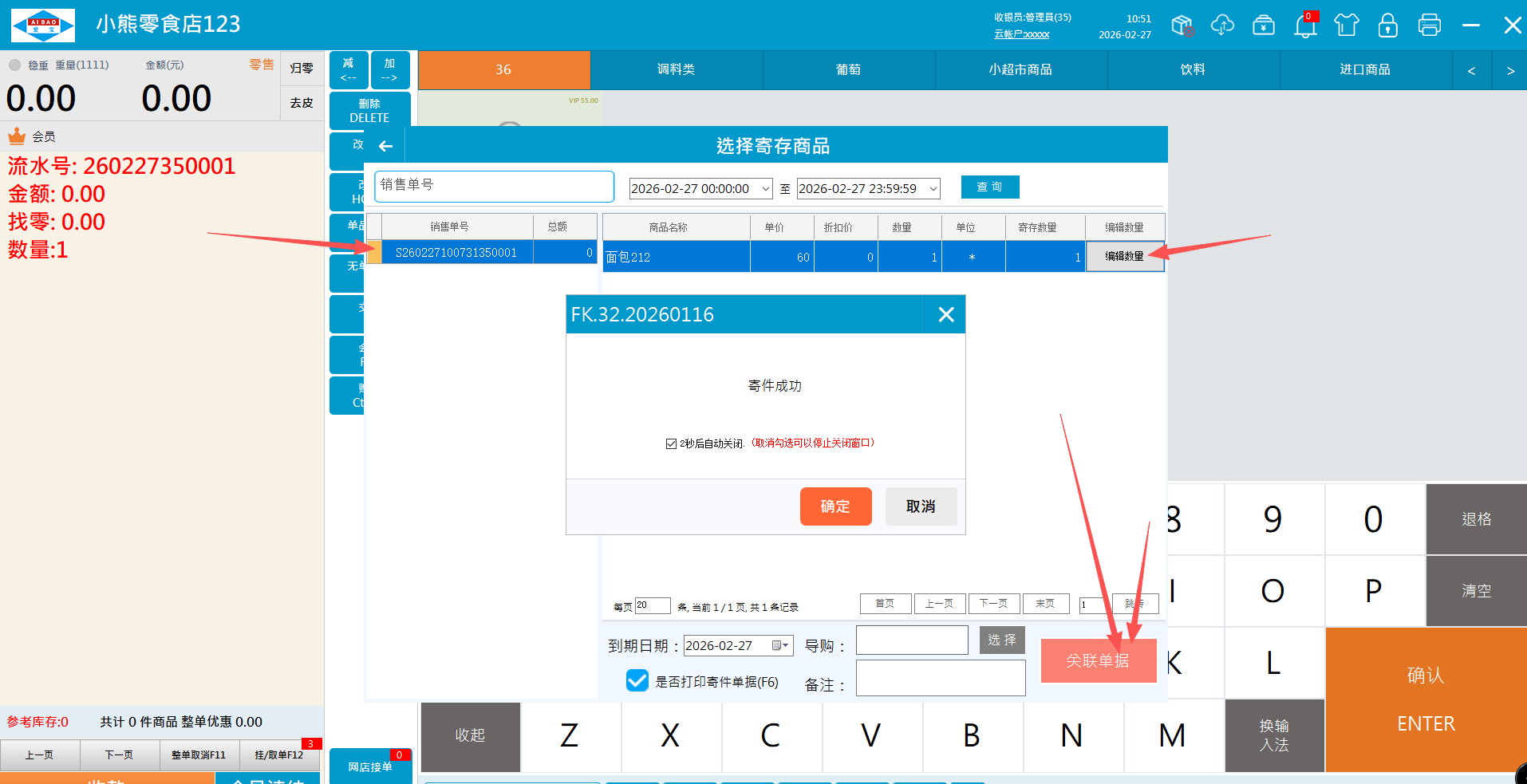 1.2.2、选择要寄存的销售单,输入寄存数量,点击关联单机即可