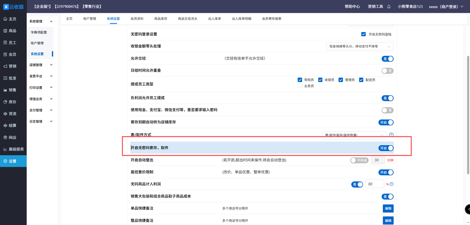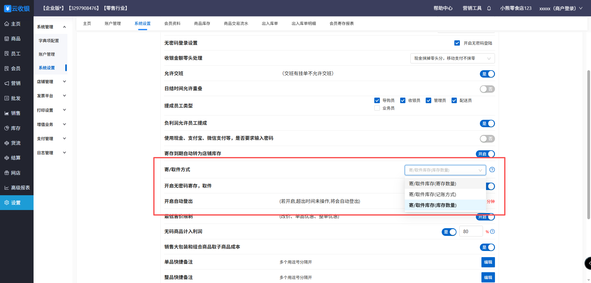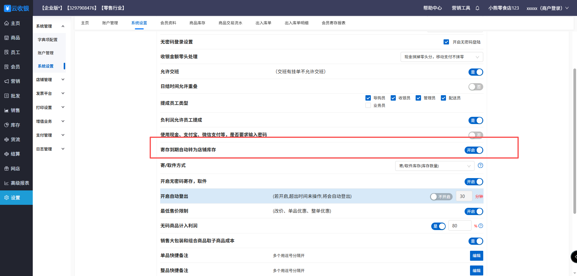 5、寄存到期自动转为店铺库存设置,在前台寄存时设置到期时间