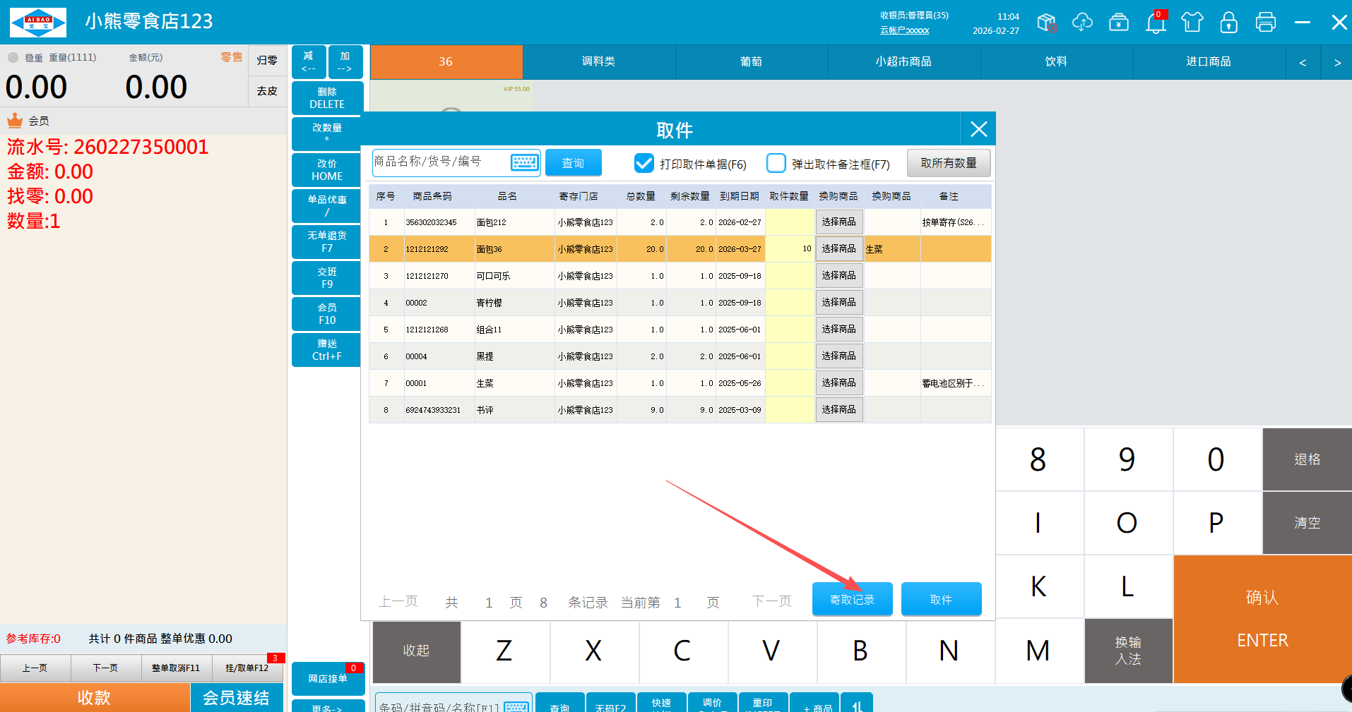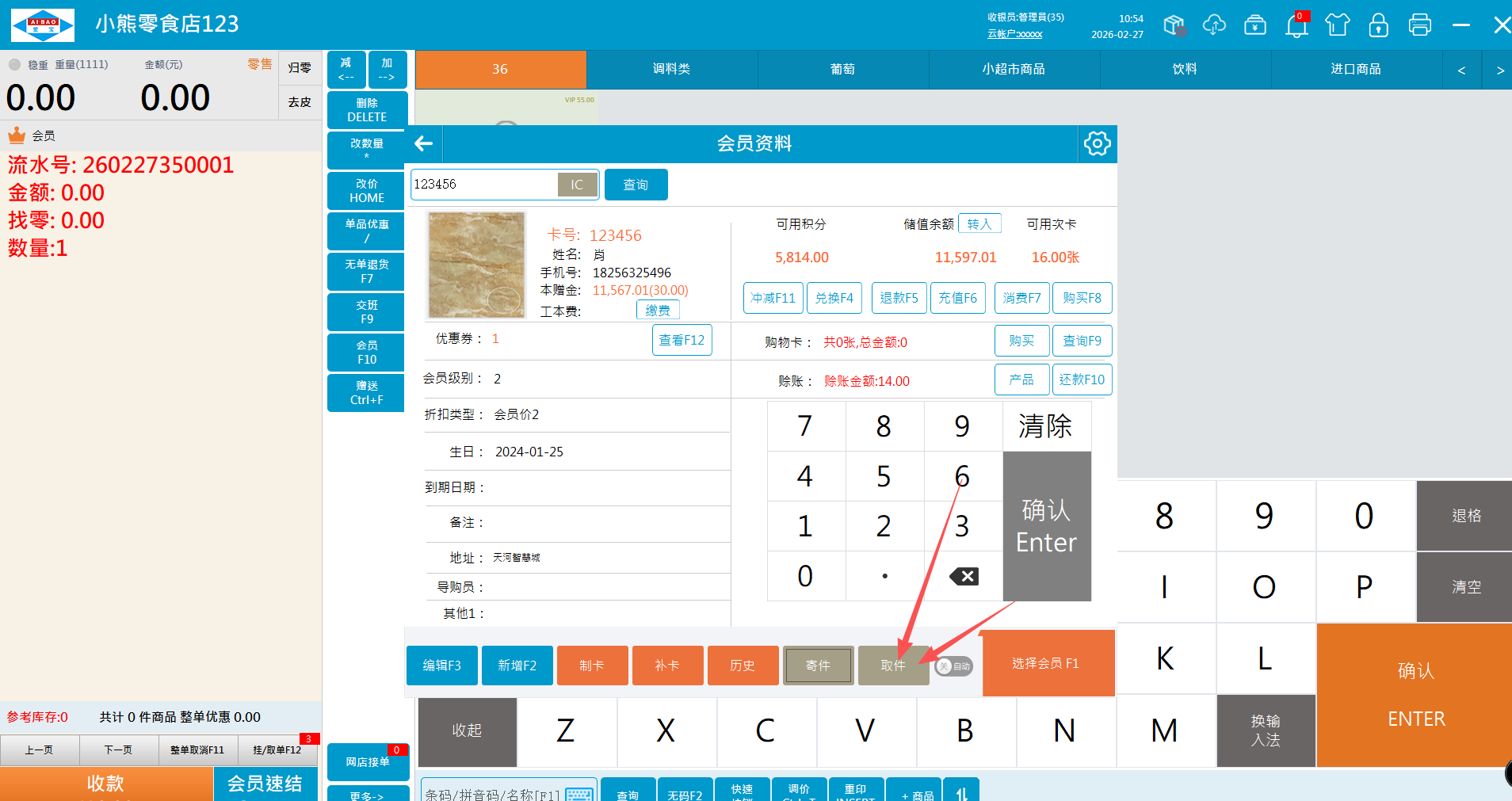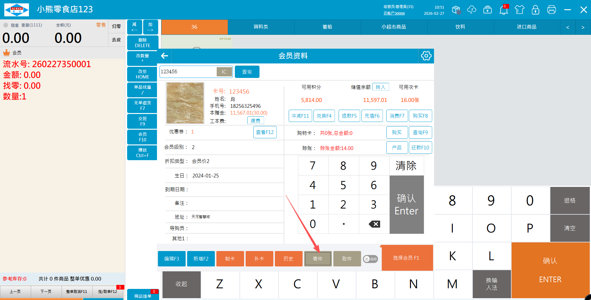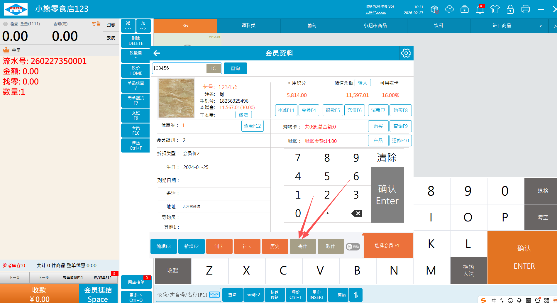 1.1、直接选商品寄存,选择会员点击寄件