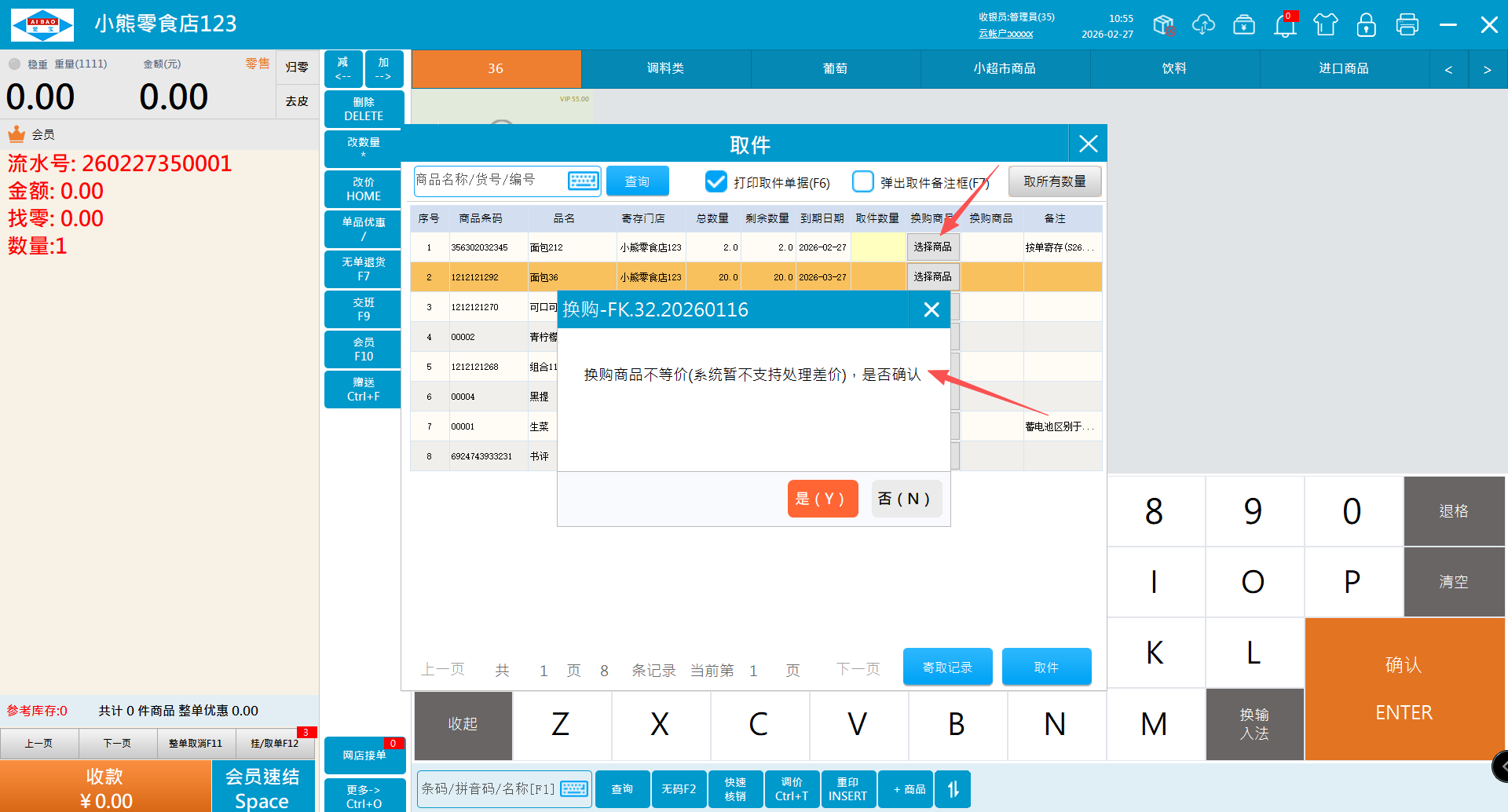 2.1、寄存的商品需要换购的话,点击换购选择商品,这里换购的商品不支持处理差价