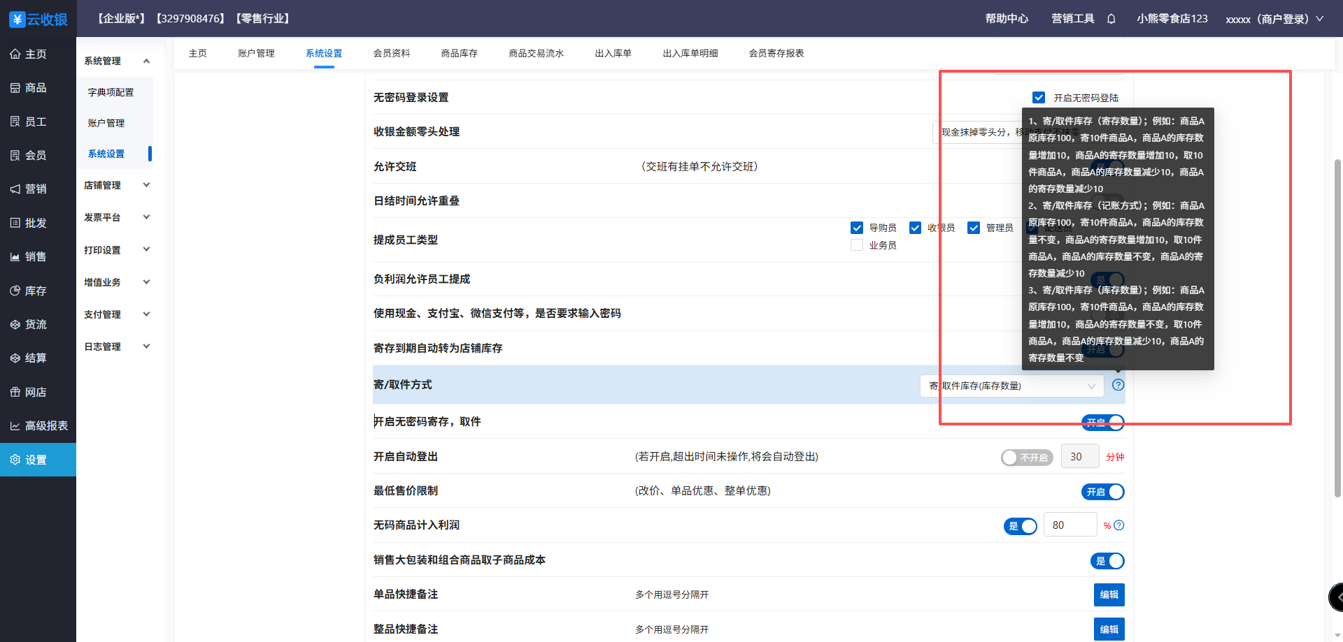 4、寄取件方式说明:根据需求设置对应的寄取件库存