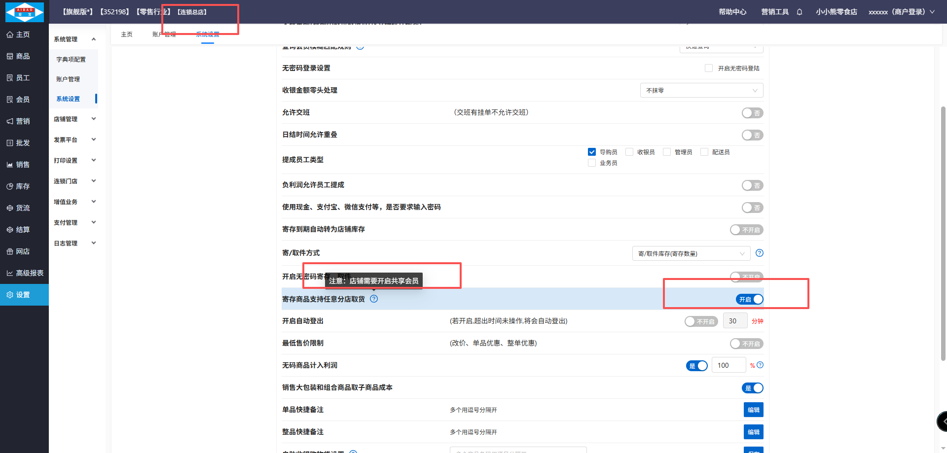 7、寄存商品任意分店取货,在总店设置,需要开启会员共享