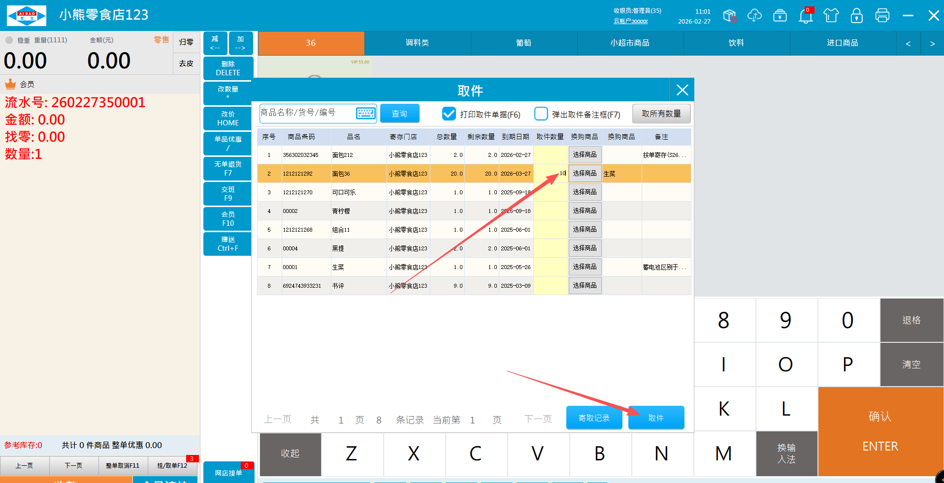 2.2、取件时输入取件数量,点击取件即可