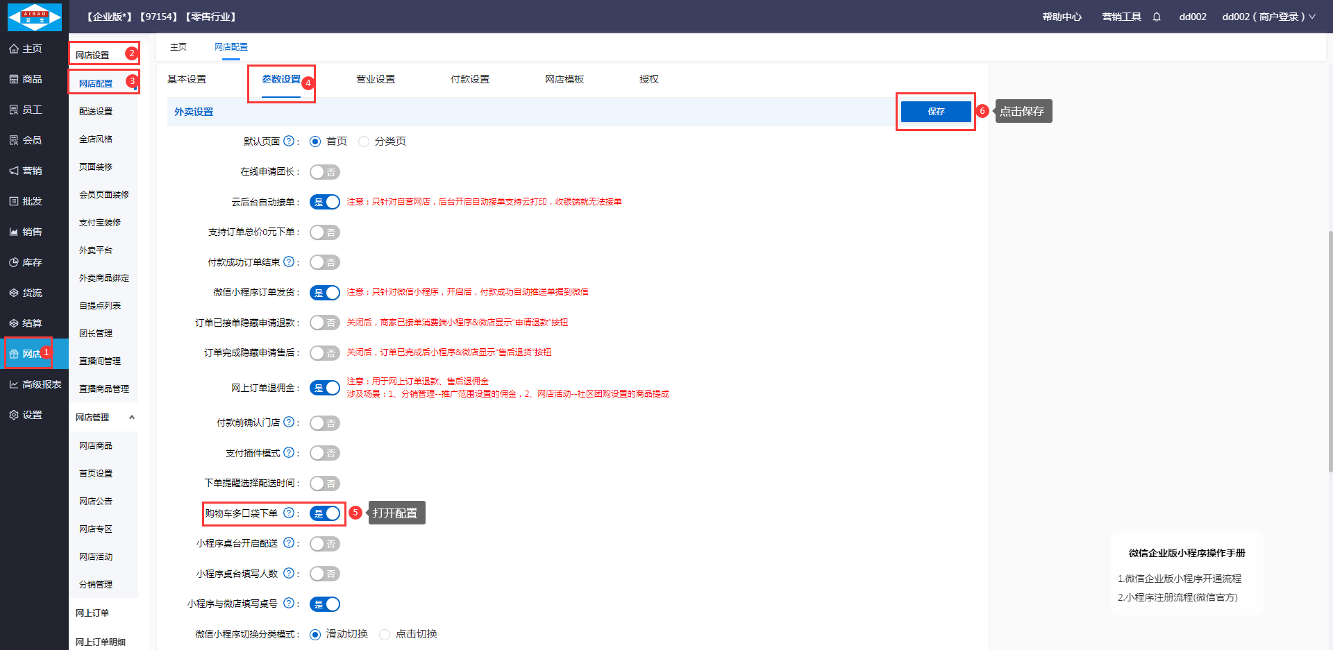 一、场景说明 商家可以通过消费机后台,配置链接云收银账号的小程序,客户通过消费机小程序,进入到云收银的小程序进行点餐下单,商家在云收银收到点餐订单后,可以按照正常流程给客户配送。 二、使用流程 1.消
